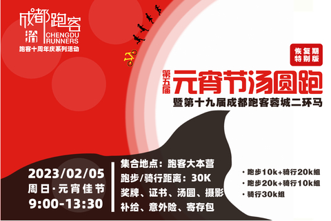 本次汤圆跑活动为成都跑客元宵节经典城市跑活动。考虑到阳康后跑者们需要循序渐进恢复身体、提升有氧能力,本次活动为恢复期特别版,不计时,非竞技,参与者可以跑步+骑行、骑行、跑步+坐车等方式完成。骑行可以骑自己的自行车,或共享单车。
