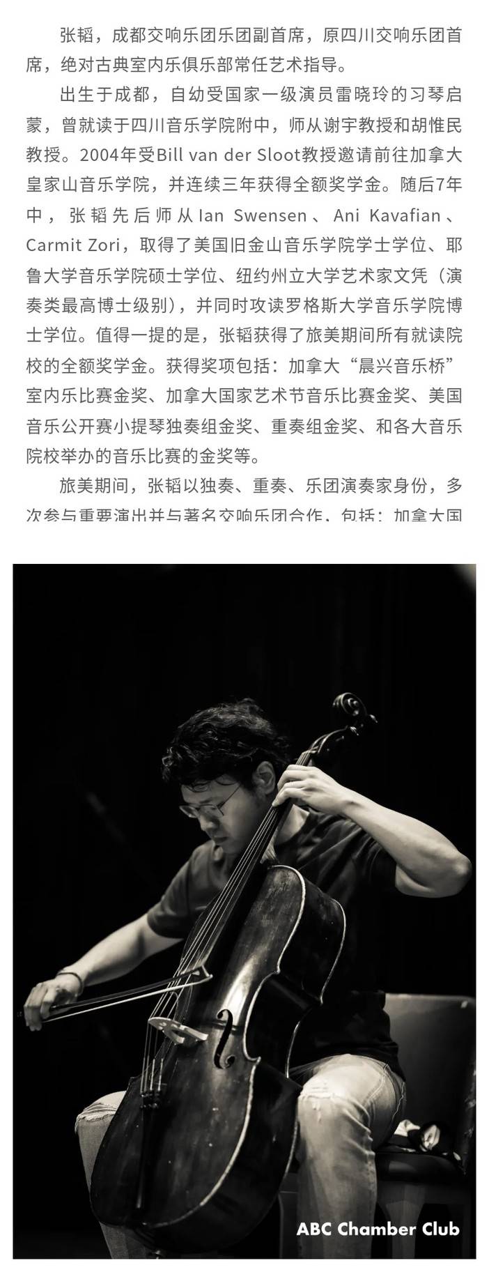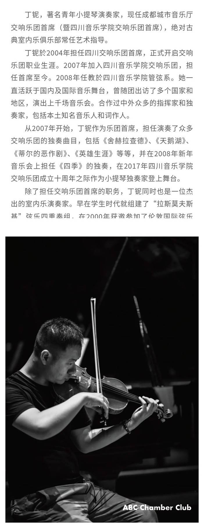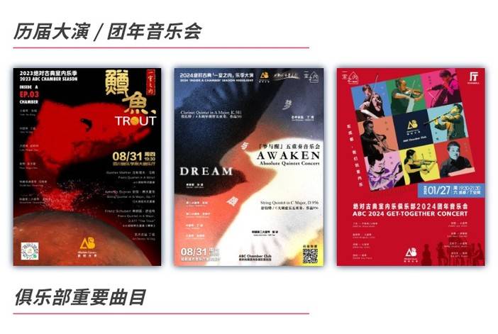 绝对古典室内乐俱乐部(ABC Chamber Club),是由成都古典音乐厂牌「绝对古典」携手本土优秀的音乐家们共同发起的室内乐平台,旨在每年举办的绝对古典「一室之内」乐季上,精心挑选并深度演绎室内乐宝库中重要、有趣或不可或缺的作品,连接志同道合的艺术家与听众,传递“快乐、亲近、分享、融合”的室内乐精神。自2023年8月31日「鳟鱼」大演正式起航以来,绝对古典室内乐俱乐部已同蓉城古典音乐爱好者们相伴两年半时光,创造出一个又一个令人难忘的经典硬核现场!