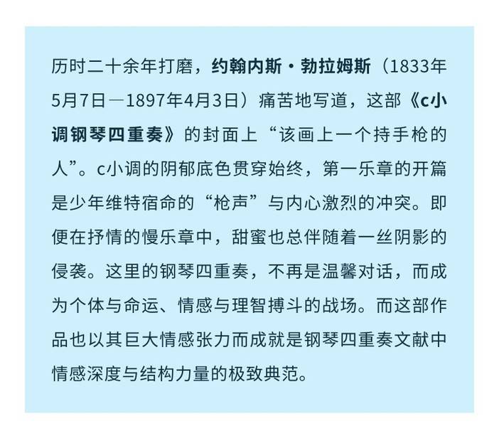 如果说舒曼的“情书”写于阳光之下,那么勃拉姆斯的《c小调钢琴四重奏》 则诞生于内心的漫长黑夜。这部作品因其开头的标志性“枪声”而被称为“维特四重奏”——维特,这位德国大文豪歌德笔下为爱烦恼绝望的青年似乎是勃拉姆斯的化身,成为了本场音乐会的第二位隐形男主角。这部份量极重的作品的创作横跨1855-1875二十年,与勃拉姆斯对克拉拉那份刻骨铭心的无望情感紧紧纠缠,音乐在挣扎与抚慰、黑暗与曙光之间反复徘徊,凝成一封关于爱中那些难以言说的痛楚、坚韧与接纳的“密信”。