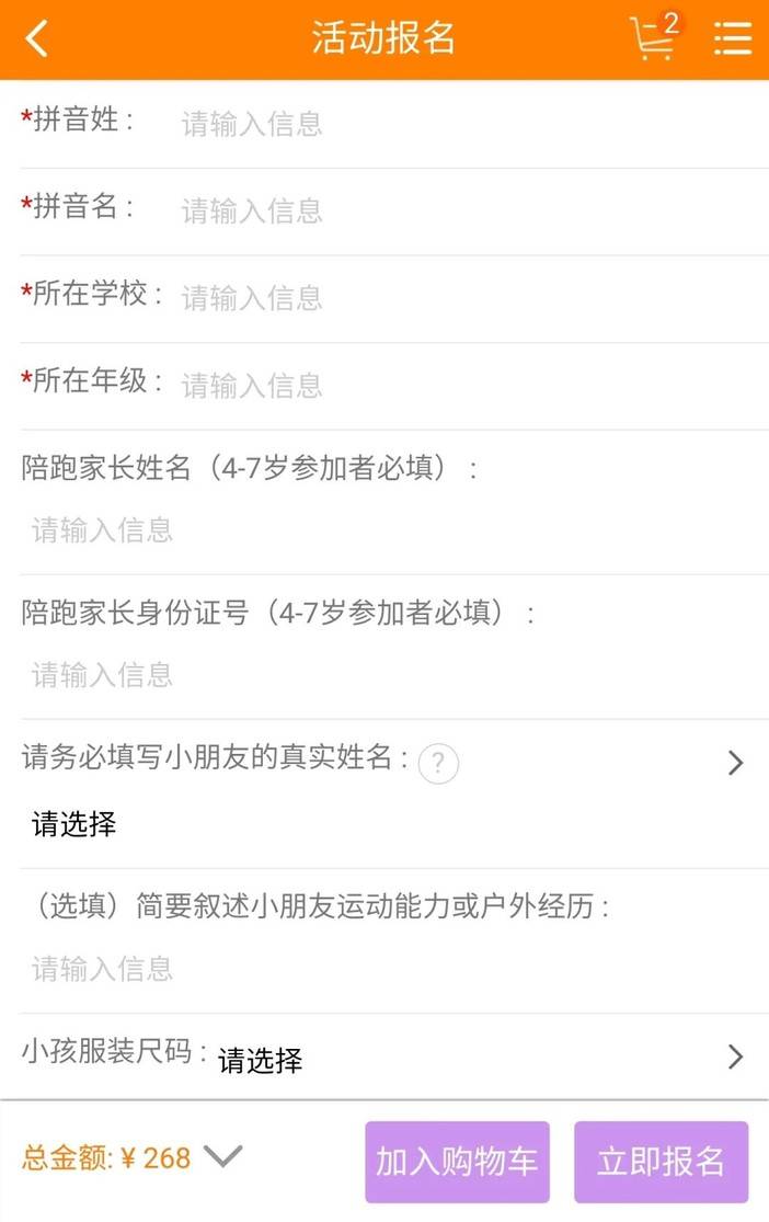 解释:本次活动要求参加4-7岁3公里组的小孩,必须有家长陪跑,因此报名费中已经包含了家长陪跑的资格,不需要再另外报名,但必须提供陪跑家长的身份信息,方便购买保险和联络。