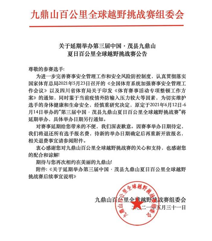 关于延期举办“第三届中国·茂县九鼎山夏日百公里全球越野挑战赛”后续事宜的说明