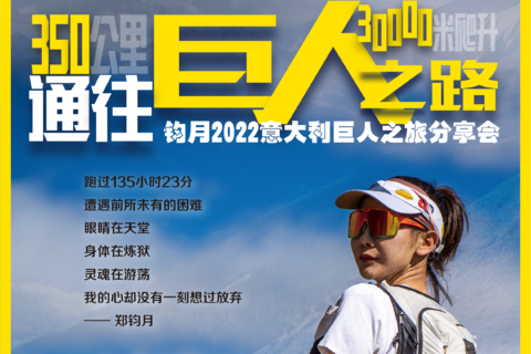 本周日10月16日,钧月与热土越野携手带来最新鲜、最火热的“巨人之旅”分享会。真性情又爱分享的钧月,有着太多好玩、有趣、痛苦、折磨的传奇龙门阵和精彩影像,更有满满的实用干货,从训练、装备、补给、比赛策略的角度,讲述自己的人生,如何从一个温婉时尚的服装设计师,变身成为遍览群峰的山野“巨人”。