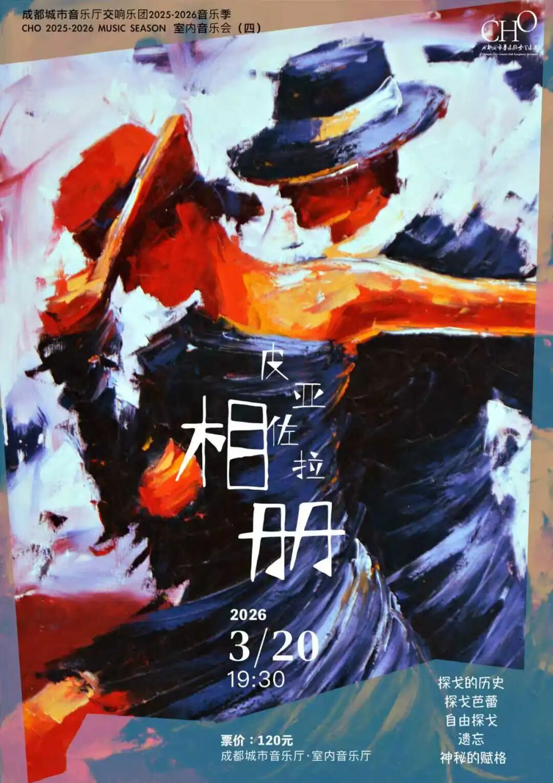 2026年3月20日成都城市音乐厅交响乐团将汇集各声部演奏家,以室内乐编制的纯粹形态,呈现《皮亚佐拉相册》。让我们在琴弦、键盘与呼吸之间,共同步入这部属于探戈、也映照灵魂的声音图景。