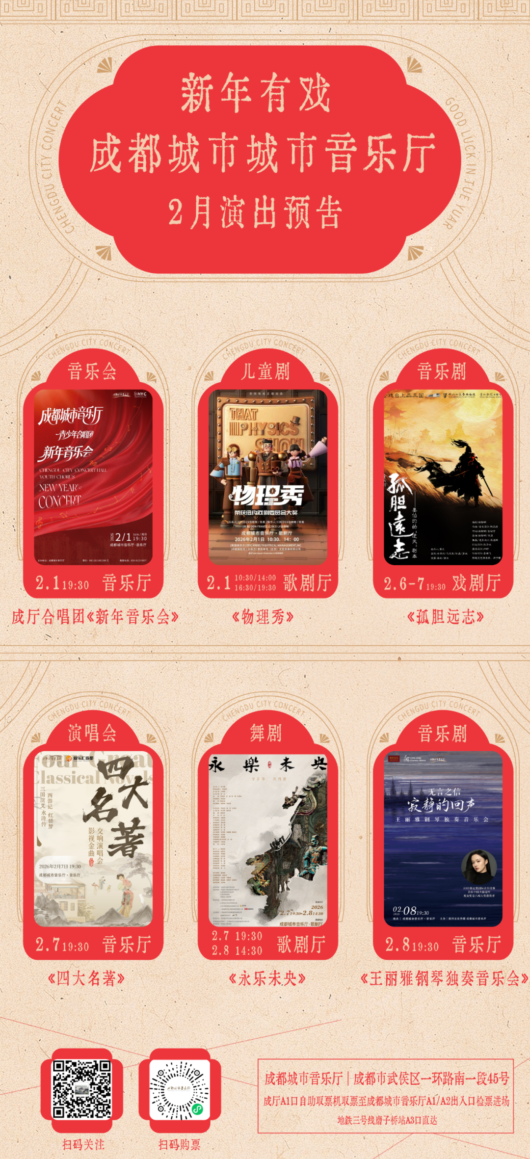 5、成都城市音乐厅公众号购买:请持取票信息(短信取票码)于成都市武侯区一环路南一段45号成都城市音乐厅A1口自助取票机取票至成都城市音乐厅A1/A2出入口检票进场。